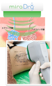 マイクロウェーブというのは、科学的な特徴として、極性分子(水分子)に吸収される特徴を持っており、水分子に吸収されたエネルギーは熱に変換される特性をもっております。 その特徴を利用し、直接汗腺を熱処理することで原因となる汗腺機能を不能にするという手法となります。